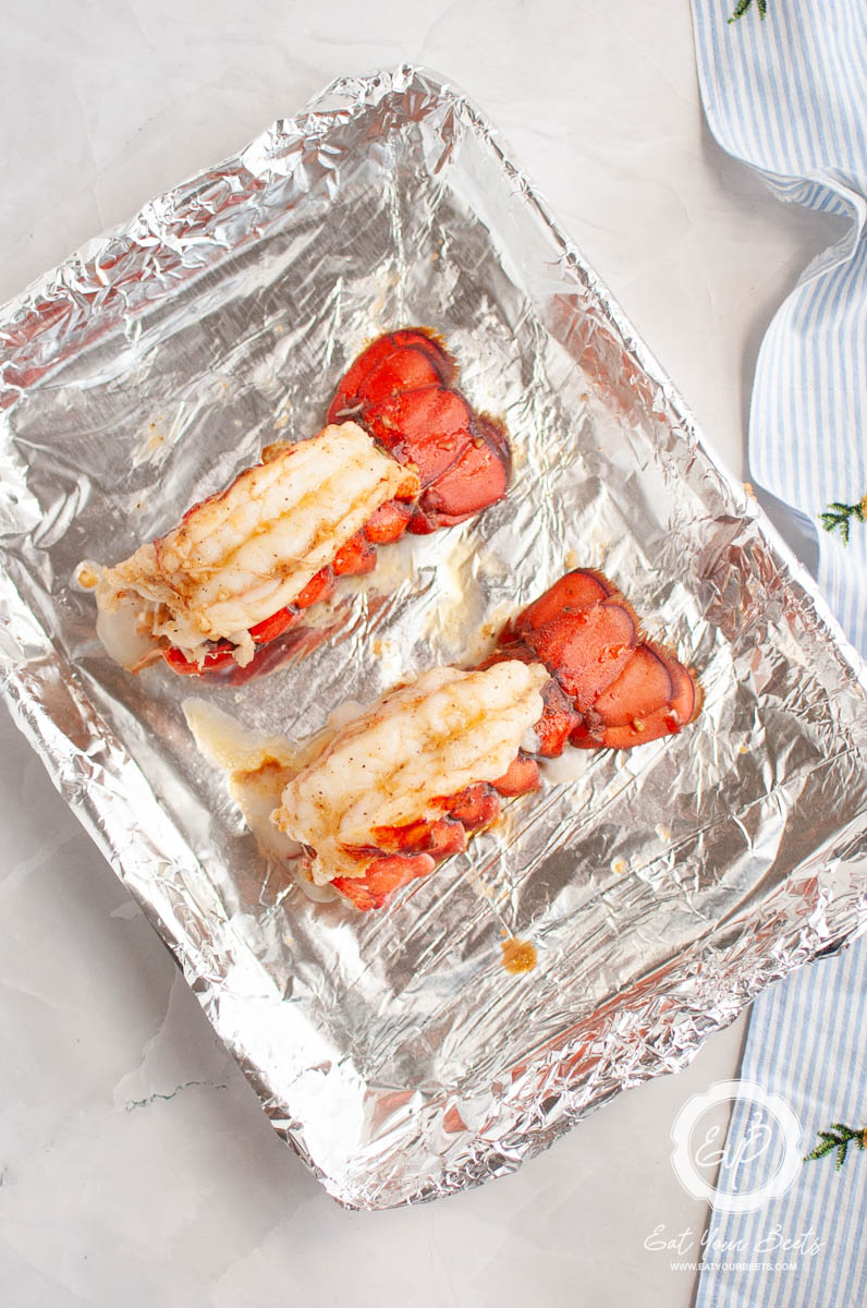 - Step 4: How long to bake lobster tail? Bake on a foil-lined tray for 10–12 minutes, or until opaque and lightly browned on top. Serve immediately with extra melted butter, parsley lemon wedges, and your favorite sides.