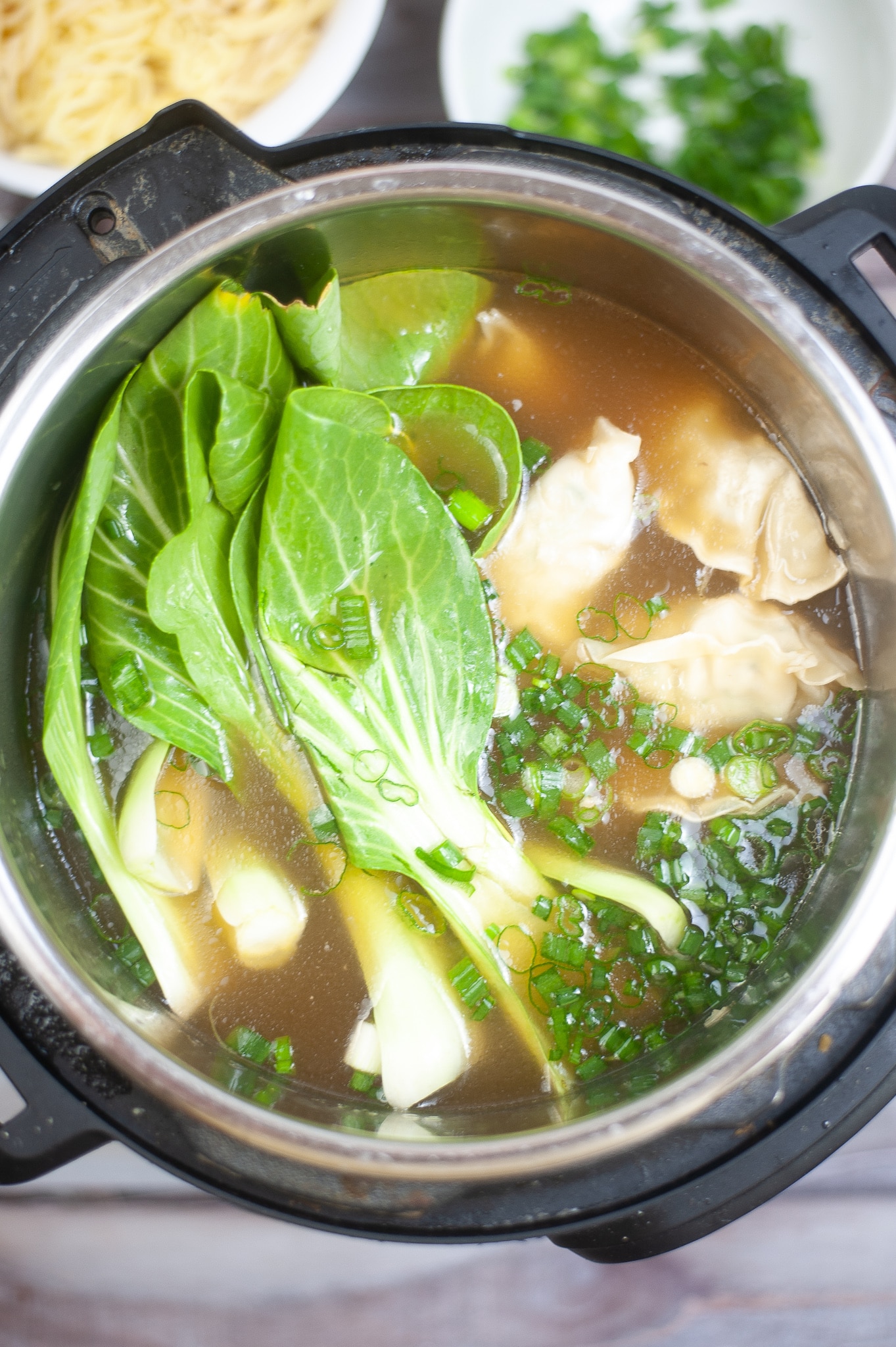 - Add the bok choy, onions, noodles, and dumplings.